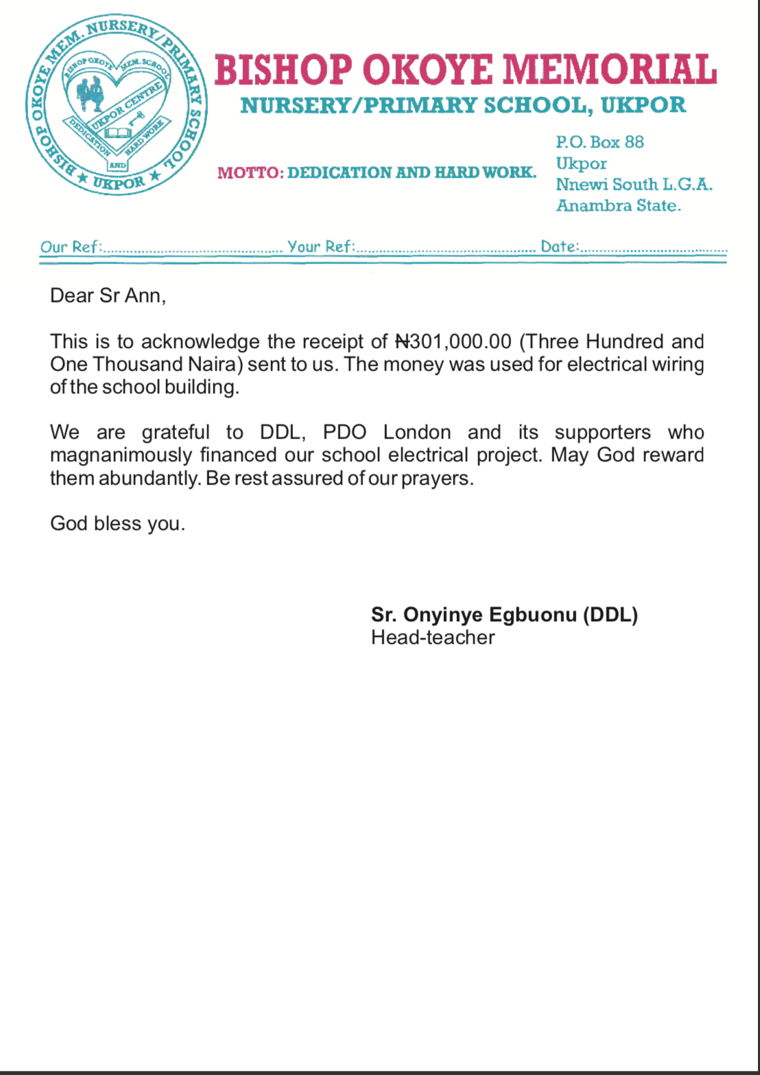 TESTIMONIALS Bishop Okoye Memorial Nursery/Primary School, Isueke Umabor, Eha-Alumona Nsukka, Enugu State, Nigeria”Bishop Okoye Memorial Nursery/Primary School, Ukpor, Anambra State, Nigeria”